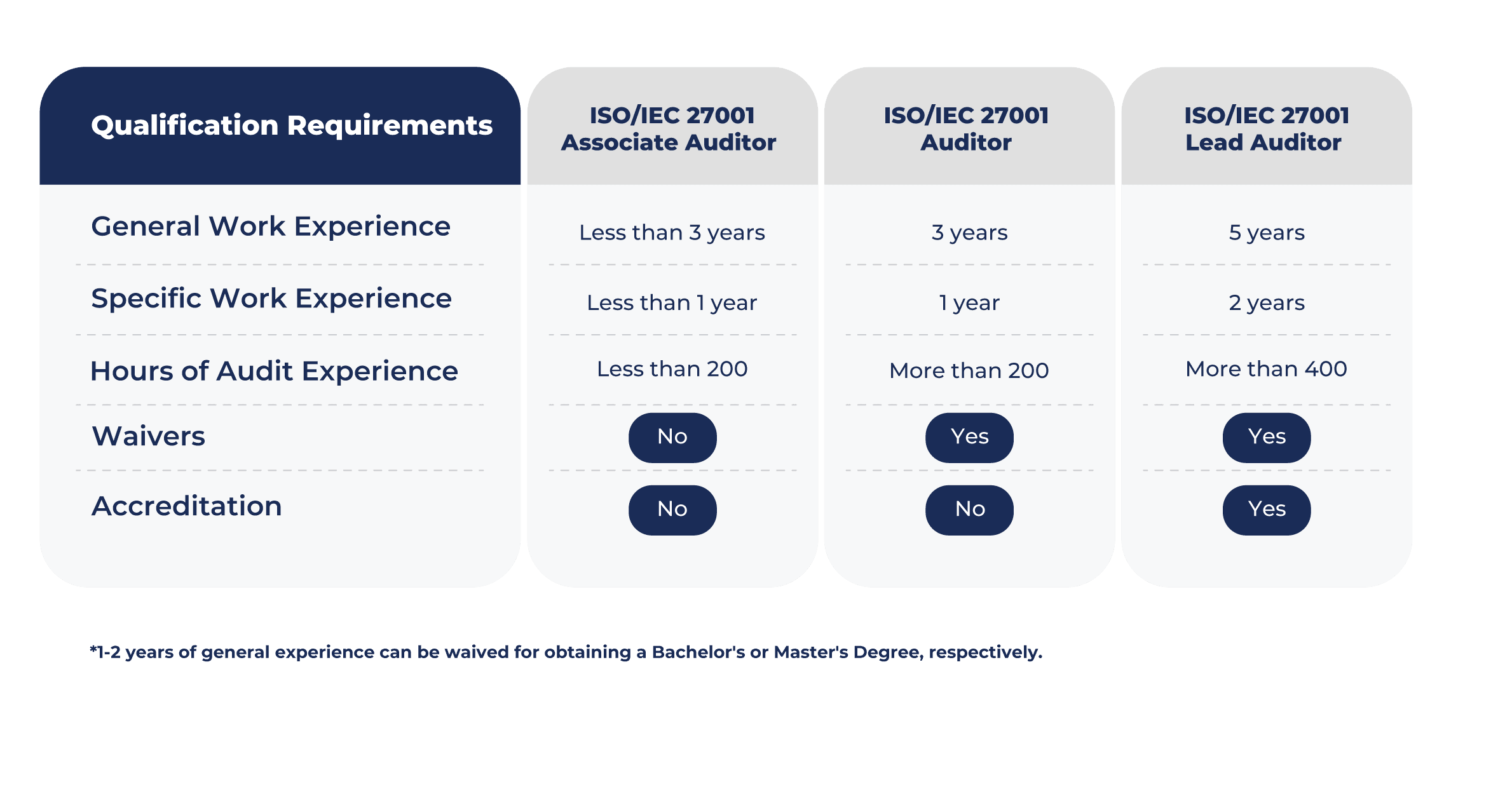 Specific Experience: At least 2 years in information security, including 400 hours of ISMS audit tasks.